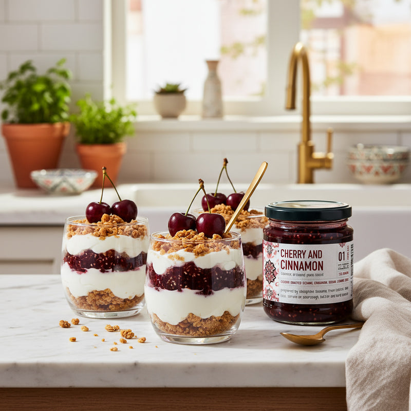 A refreshing, layered dessert that highlights Jar Thuraya’s cherry jam, fruity, spiced, and full of charm