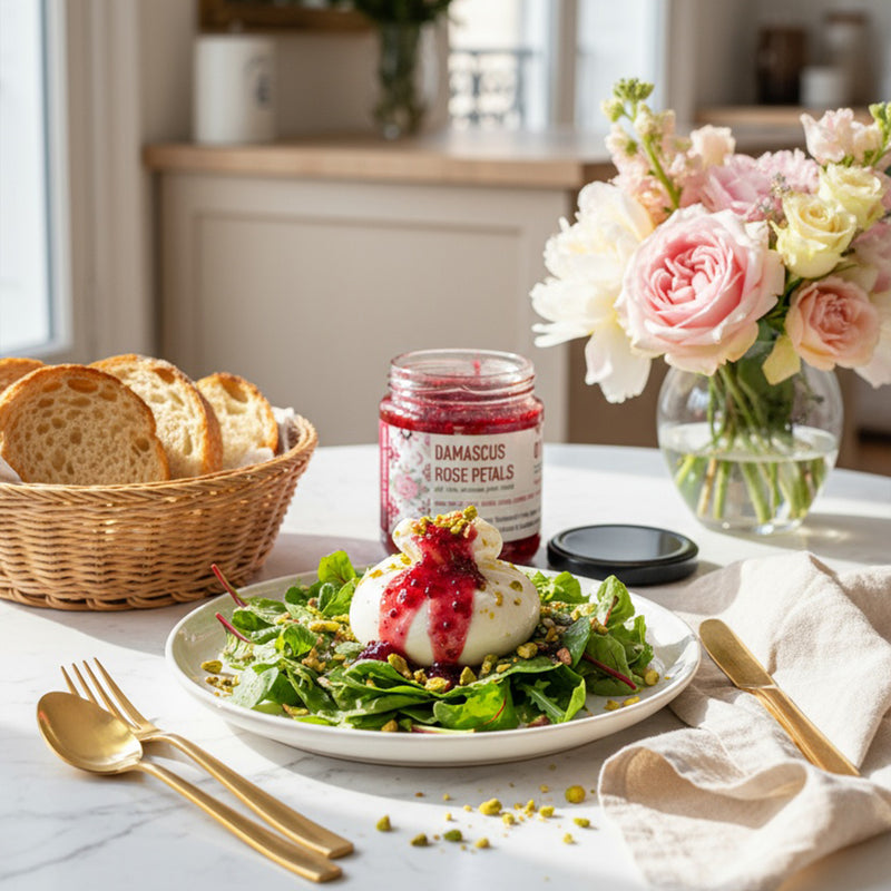 A fragrant, elegant Lebanese twist on the classic burrata salad, balancing creamy, floral, and peppery